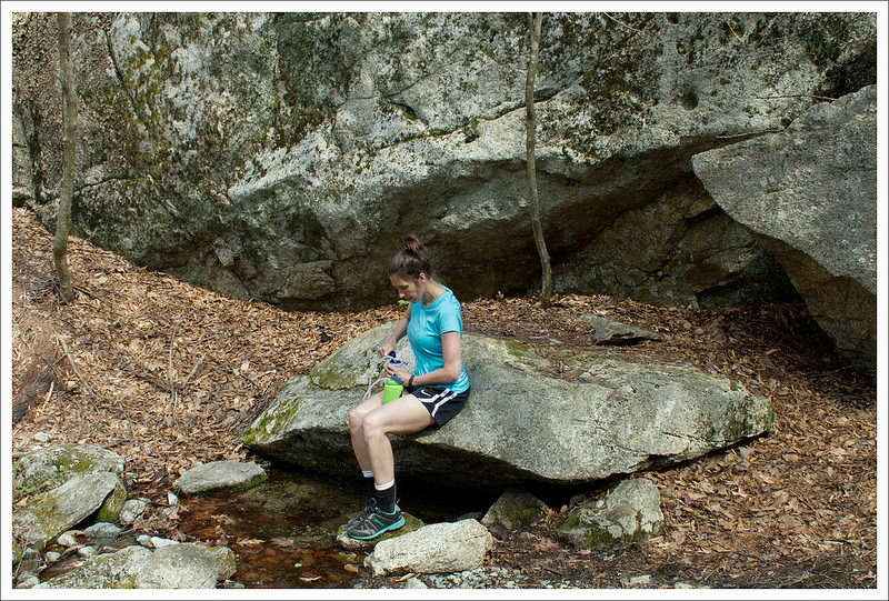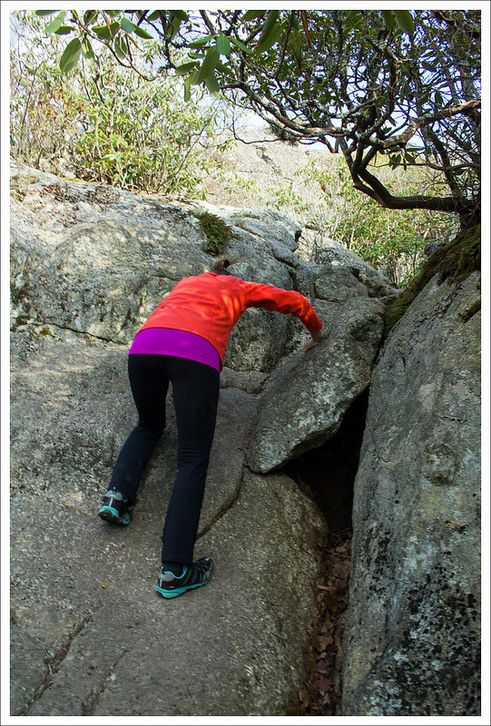 At 1.5 miles, we reached an opening in the trees which gave a backlit view of Buzzard Rocks on the other side of the valley. I can’t look at Buzzard Rocks without recalling the horrible ankle sprain I suffered there several years ago! We chatted with an older gentleman at the overlook – he warned us that the trail was about to get rocky! He wasn’t kidding! For the next 1.25 miles, the trail was a loose jumble of pointy, shifting rock.