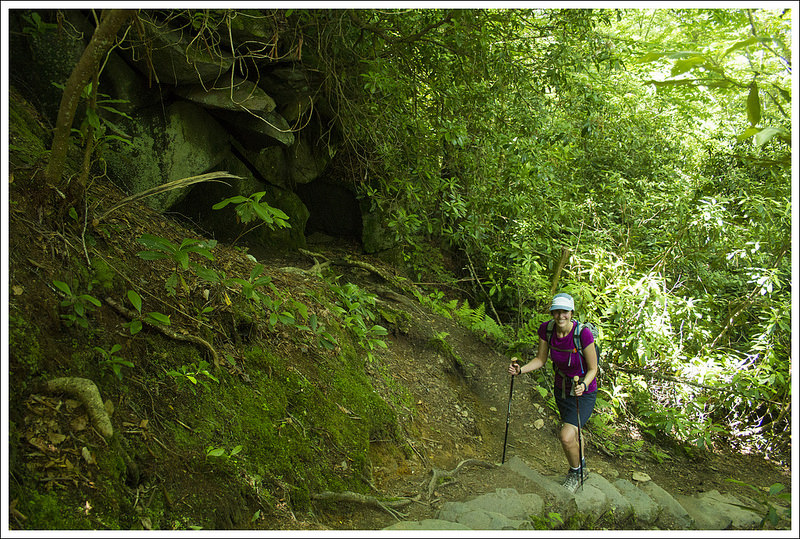 After we passed the campsite, the trail began to level out and follow a ridgeline. In .2 miles, we reached a blue-blazed spur trail to the left leading to the viewpoint at Rocky Bald. The trail climbed for about a tenth of a mile over a wide shelf of rock before reaching another fringe of trees. There were a few dry campsites tucked in to flat spots between the trees. At the outer edge of the line of trees, there was a rocky ledge with a log bench and an excellent vista. There was sunshine, but there were also many fast-moving low clouds. We weren’t sure how long the conditions would stay clear and dry, so we moved on to visit the next viewpoint.