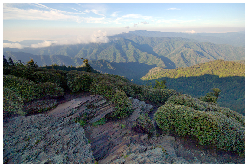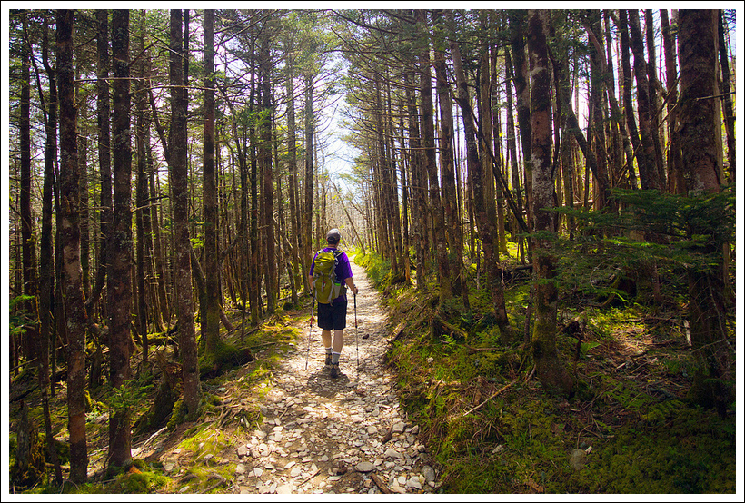 Silers Bald was less impressive than we expected. Evidently, 100 years ago, balds stretched from Clingman’s Dome all the way over to Gregory Bald (which is hiked from Cades Cove). The land was used for grazing. Since becoming a park, nature had filled most of the bald terrain back in. Below: One of our first views of the day not covered by clouds; As we approached Silers Bald, the forest changed from pines to grass and deciduous trees; Another view of Silers Bald.