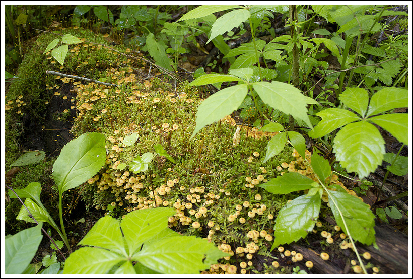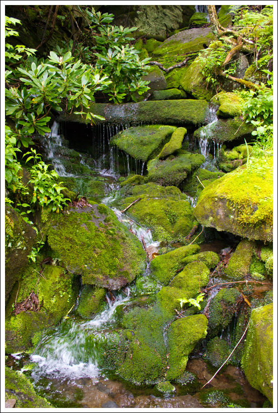 Adam hikes up log stairs along one of the steeper sections of trail. If you look closely, you can see another hiker a little bit ahead of Adam. Upon chatting with him we learned that he’s hiked all but 30 miles of trail in the Smokies. Impressive! Below: Trail junction; Another waterfall hidden in the woods. We could hear larger falls somewhere in the gorge below; Places that should have offered views were nothing but fog; Everything was moss-covered; Some interesting cliffsides on the hike up.