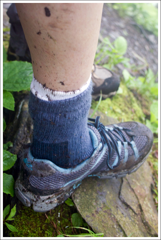 Adam approaches Grotto Falls. Below: We saw lots of llama prints and boot prints on the trail; The damp conditions were perfect for snails – we saw so many along the hike; Adam checks out the other side of Grotto Falls; Christine passes beneath the falls, All the vegetation along the trail was so lush and green; Catawba rhododendrons were in full bloom; Our legs and boots got really muddy on the hike up.