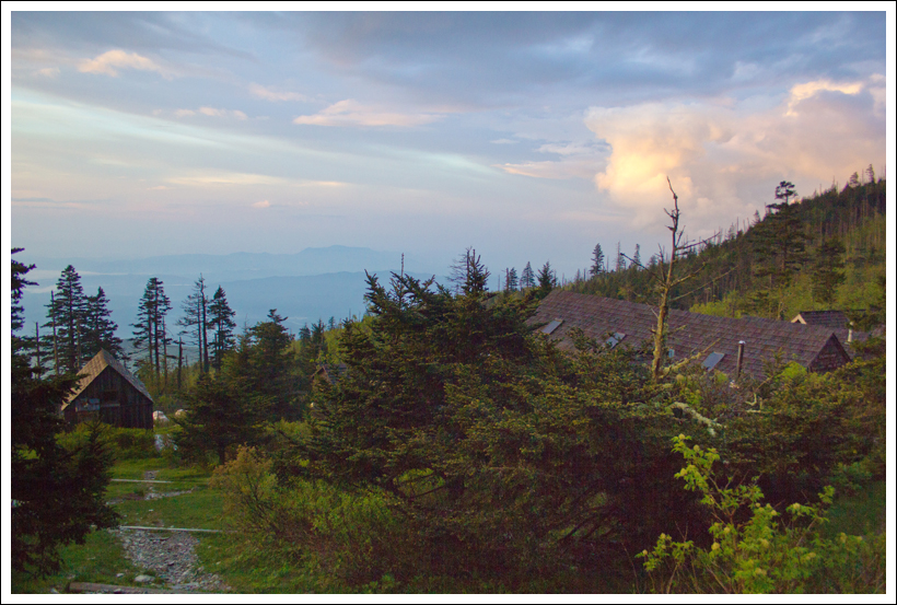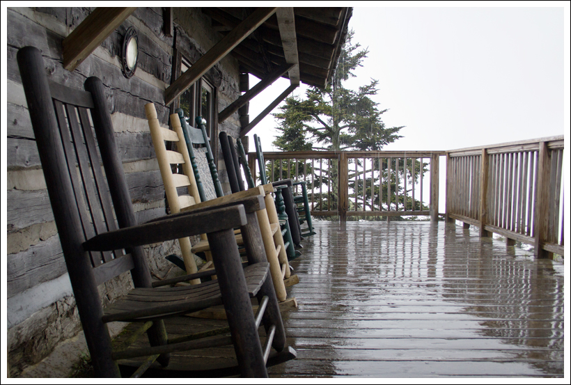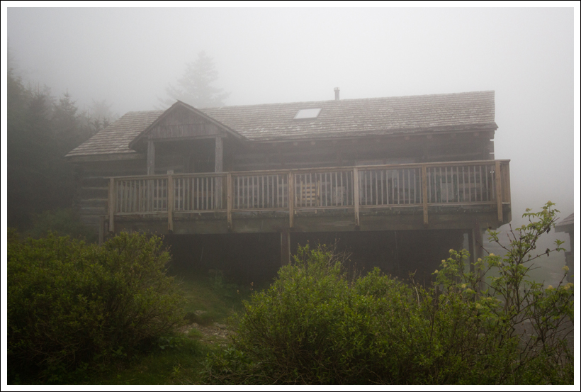 The rest of the afternoon, we hung out in the lodge office and played cards and watched as other guests arrived. I picked up a guitar and played a bit while Christine went to get some more photos of the lodge. We took a short nap, tired from our uphill climb, and met some of the people that would share our cabin with us for the evening. The dinner bell rang at 6:00 p.m. Dinner is served family style and there was plenty of food to go around. Christine had opted for the bottomless wine glass to accompany dinner and we stuffed ourselves on delicious food. After a few hours, the rain was stopping and the clouds were breaking enough to give us a little sunshine. We decided to hike up .25 miles to Cliff Tops to try and catch a view of sunset. The view was still completely in fog. We headed back to the lodge for a while and continued to play cards before we made our way back to the cabin to read by and headlamp. After a little while, we snuffed the lamp and went to sleep in the highest elevation cabin east of the Mississippi River.