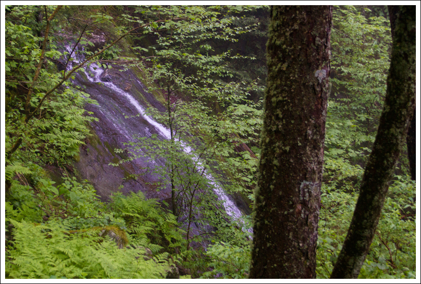 After the falls, the climbing becomes a bit steeper, but the trail is still relatively smooth and well graded. On the climb up, we saw tons of llama footprints (and llama droppings… which look strikingly like Raisinettes or Goobers.) So far, we’d been relatively lucky with weather. It was thin overcast and looked like the sun might actually burn through. But within the next mile, we stepped into the clouds. The way up wouldn’t be clear for the remainder of the hike. Nevertheless, the forest looked beautiful in the mist. Everything looks greener and more lush under cloudy skies. We crossed a number of small streams and waterfalls by traversing rock hops. We saw tons of blooming Catawba rhododendron. There were snails everywhere along the way. The damp, mossy environment must be perfect for them.