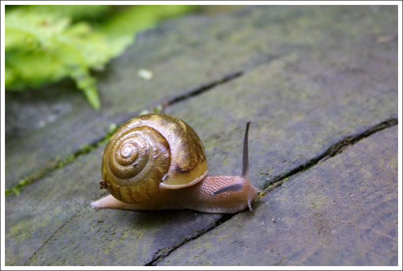 A peek inside one of the dilapidated Elkmont cabins. Below: Adam walks the Little River Trail; the Spence Cabin; We saw lots of big snails on the trail.