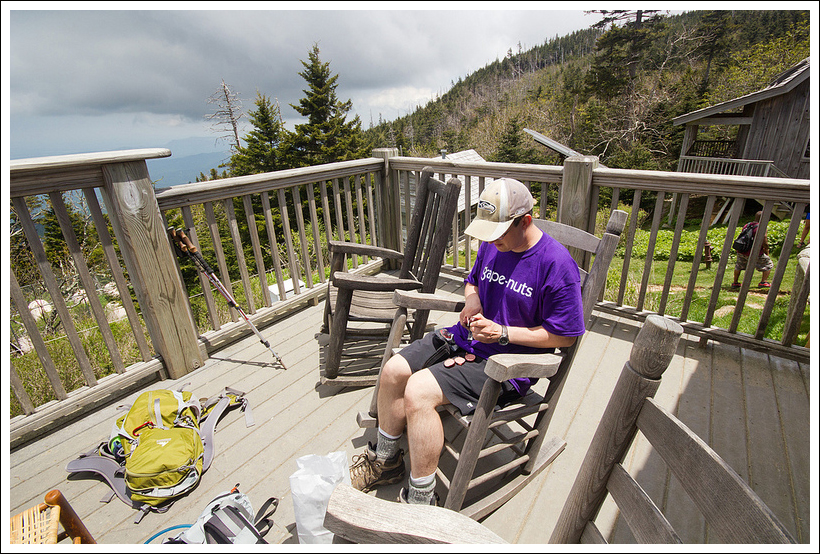 I climbed up to the top and said WOW! Adam didn’t feel comfortable with the open, rattling stairs, so he hung out at the bottom while I chatted with a couple at the top. They had hiked up earlier from the NOC and were waiting to meet up with their son, who was on a solo backpacking trip. They were really fun to talk to – both were veteran AT thru-hikers and REI employees. We talked about favorite spots on the AT and chatted a bit about gear. I always love meeting people like them on the trail!
