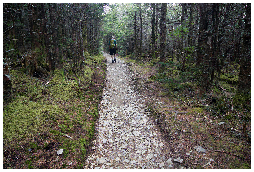 Around 5,500 feet, we caught up with a hiker that had left the parking lot just about 10-15 minutes ahead of us. I had noticed him when we were packing up our bags. We stopped to chat with him. It turned out that he has hiked almost every single mile of trail in the Smokies. Of the nearly 900 trail miles, he only has about 35 miles to go. He had been up LeConte numerous times and we really enjoyed chatting with him about the different routes and about hiking GSMNP in general.