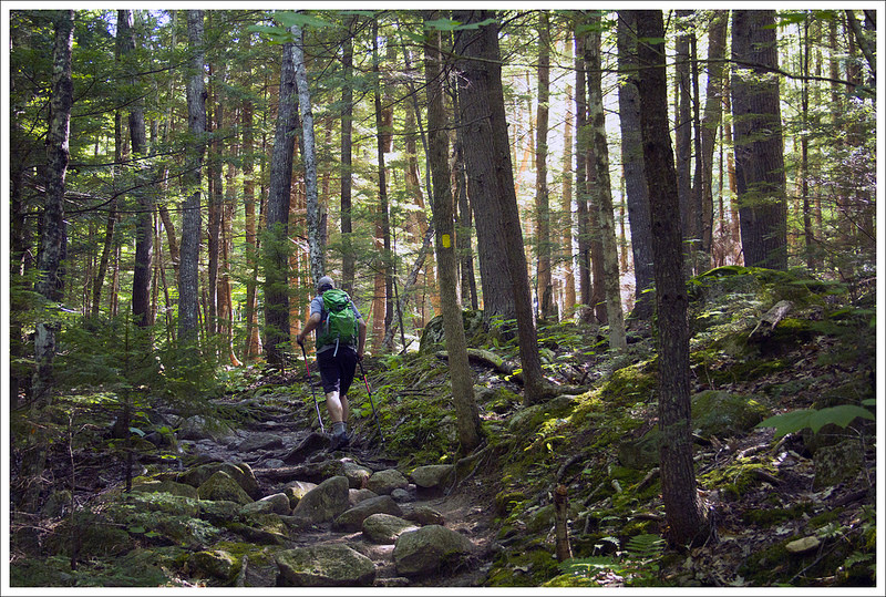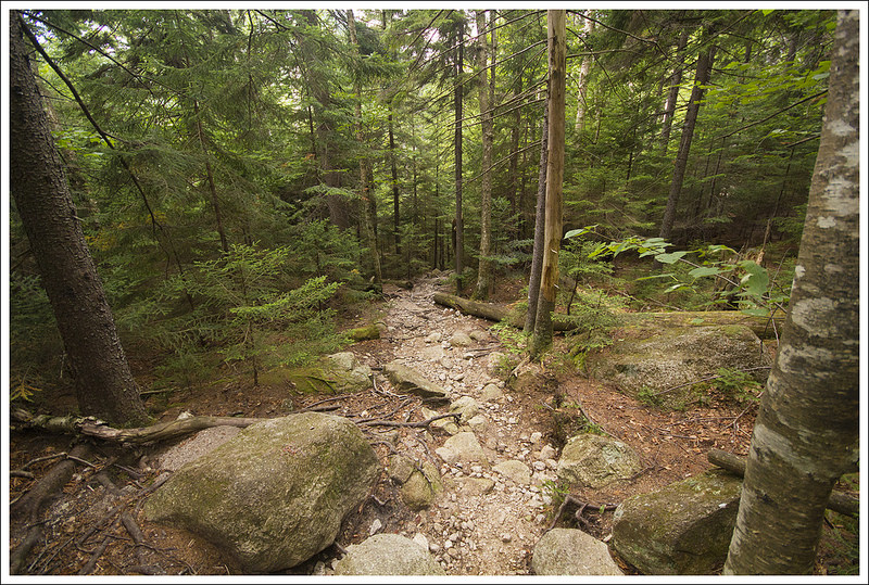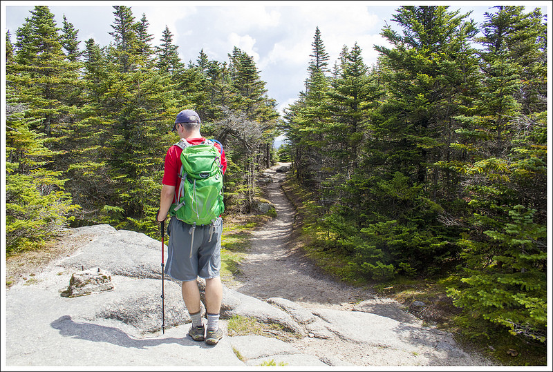 We have made it up to New Hampshire the last several years. Each year we try to do at least one of the Presidential peaks – big, granite mountains named after our country’s past presidents. This year, we decided to tackle Mt. Eisenhower by way of the Edmands and Crawford Paths. We read in our Falcon Guide to Hiking New Hampshire that this trail route had a moderate grade and the footing was “pleasant”