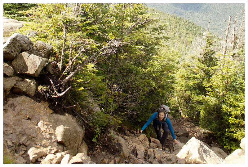 I very much enjoyed the little rapids and waterfalls along Snyder Brook early in the hike. Tama Falls was especially impressive. After we moved away from the stream, the hike was basically just a climb in the woods. As we ascended the trail got rockier, bit by bit. The last half mile to the hut was insanely steep and rocky. In one spot, my shoe got so solidly wedged between two rocks that I had to unlace it and contort my ankle to free myself. It took efforts from both of us to release my shoe from the rocks. It’s a good thing trail runners are so soft and flexible, because my feet definitely needed both shoes on this hike! I think the steepness of the terrain is actually what stopped me from getting hurt when my foot got caught. We were moving very slowly, picking our way across the rocks. Had I been moving at any significant speed, I think I could have easily broken my ankle.