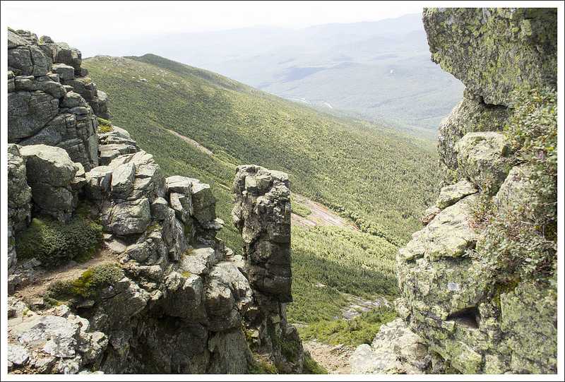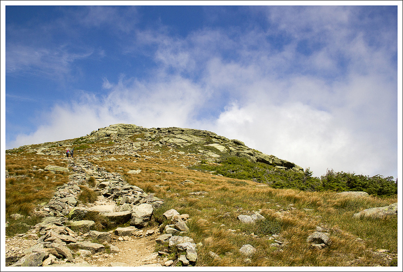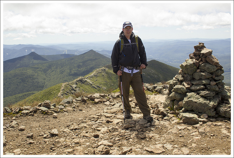When we arrived at Madison Spring Hut, it was already starting to cloud up a little. It wasn’t really overcast, but the sky had that heavy, hazy look about it. The weather was definitely changing and I wanted to make sure we enjoyed the best views possible. We headed up the Osgood Trail toward the summit of Madison. I don’t know if you can really call the path to the top a ‘trail’. It’s more of a scramble across rocks, following cairns leading you to the summit. The climb to the top is slow going, simply because there is never a simple place to put your feet. On our way up it was fun to look back and marvel at the towering peaks and the tiny hut tucked into the col.