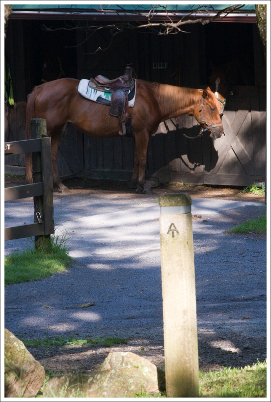 I brought my iPod along this time for a couple reasons 1) I wanted to be able to listen to my “workout mix” when climbing a couple of the big hills on the route and 2) my iPod is loaded with audio books, which I thought would be pleasant to listen to after sunset in the tent. The first big hill we hit was on the Knob Mountain Cut-Off Trail. It was really steep, so I put in my earbuds and started chugging up the hill. Listening to mindless pop music with a beat – anything from Tupac to Lady Gaga to Gnarls Barkley – makes climbing hills so much less painful. I had worked up a pretty good rhythm, listening to the early 90’s party song, “Rump Shaker”, when I rounded a curve a spotted two black bears about 50 yards up the hill. I’m not sure if they were a mom and a yearling or two adults. We looked at them, they looked at us, then they quickly decided to leave the area. I didn’t have time to free myself from my trekking poles and iPod cord to get a photo, but it was still a great treat to see the bears. Backpacking seems to involve an inordinate number of straps and buckles. Sometimes, it makes me feel like a horse pulling a cart.