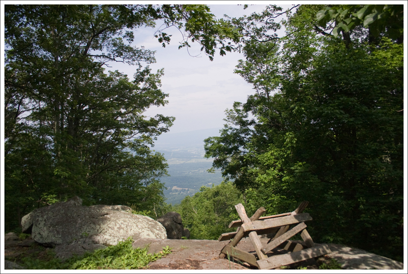After the cut-off trail met the Knob Mountain Trail, the tough climbing was over for the day. I listened to my iPod a bit more, but eventually put it away in favor of listening to the birds and the breeze in the trees. We took a snack break on the top of Knob Mountain. There weren’t any views at the summit – just shade and a ton of poison ivy. It felt really good to throw the pack off for a while and have a good stretch. I could really feel the heavier pack weight bruising my hip bones.
