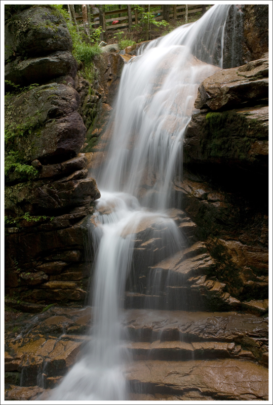 After passing the cabin, the path follows alongside an area called Table Rock. The water in the river passes thinly over a wide, smooth expanse of granite. A sign announces the beginning of the Flume. The Flume is a fascinating geological area – a narrow slot canyon carved out from thousands of years of river flow over the rock. Wooden walkways are attached to the sheer canyon walls and allow people to climb through the gorge using a series of ramps and steps. Near the top of the Flume, visitors are treated to views of the crashing water of Avalanche Falls. The falls take several directional turns through the Flume – each angle makes it look like a completely different waterfall. After passing the waterfall, be sure to take a quick peek inside Bear Cave.