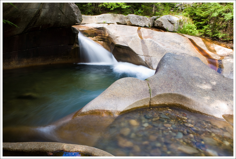 The Basin is a beautiful glacial pothole at the base of this hike. Below: Kinsman Falls is a pretty 20 foot waterfall that plunges into a wide pool at the bottom; Many of the streambeds look sculpted.