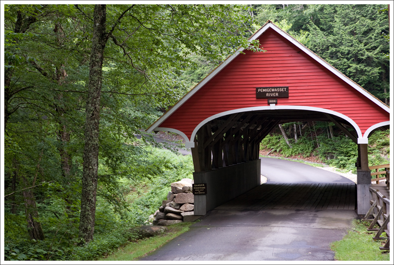 The two-mile loop starts off along a shady, wooded path that climbs down to the Pemigawasset River. In .25 miles, there is a bright, red covered bridge across the water – the bus goes through the bridge, but pedestrians cross a walkway attached to the side of the bridge. After a short uphill, both the bus riders and the walkers arrive at the Boulder Cabin. The building is full of exhibits – both historical and natural.