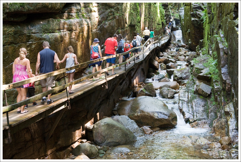 The entire Flume Gorge area is loaded with small waterfalls and cascades. Below: Tree roots grow over rocks; The crowds at Flume Gorge are always thick; Ramps and stairs allow people to climb easily through the gorge; We saw lots of chipmunks and red squirrels.