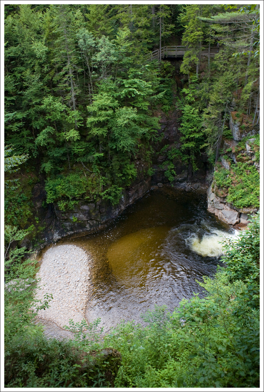 A small sign announces Kinsman Falls. From the trail, you get a view of the falls from above. The twenty-foot waterfall crashes into a large, round pool in a chasm below. There is a rough footpath down to the base of the falls – take care if you climb down – it’s slippery with numerous rocks to scramble over.