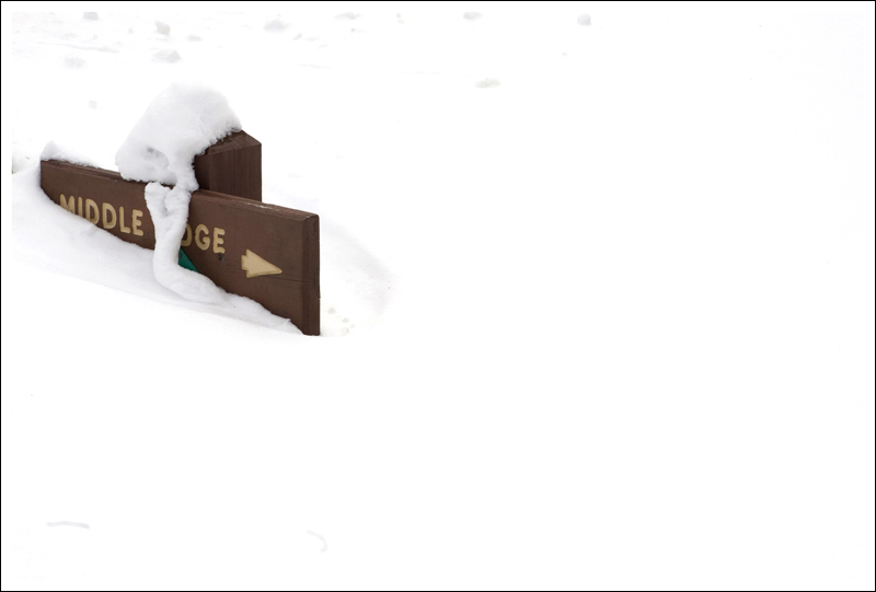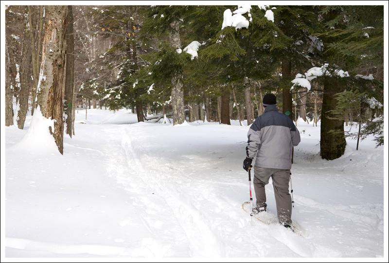 I liked the traditional showshoes we rented. They were made by Tubbs and looked like snowshoes that explorers or fur trappers in the 1800’s might have used. The trail we chose didn’t offer any grand views or spectacular scenery, but it was a beautiful walk through the woods. The few trails we’ve showshoed on before were completely flat, but the Middle Ridge trail has a couple “easy” climbs. I say easy in quotes because climbing in showshoes is always harder work than walking on a dirt trail. It’s also tough to snowshoe across deep, unbroken snow. Even though the snowshoes hold you aloft and prevent you from having to go post-holing through deep snow, you’ll still sink a little bit if the snow is deep and soft.