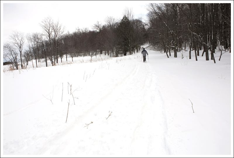 The trees and fresh snow made a beautiful and stark landscape. Below: Adam looks down on the trail from the Balsam Swamp parking area; Walking uphill across the open meadow; The snow was heavy and deep.