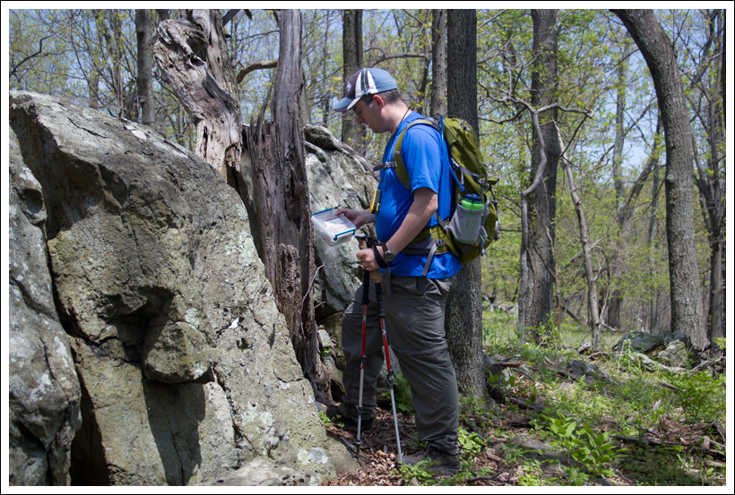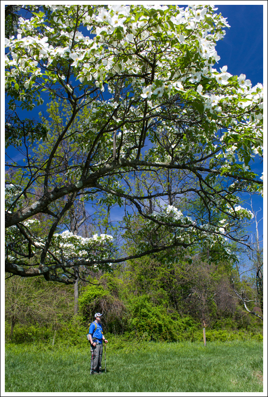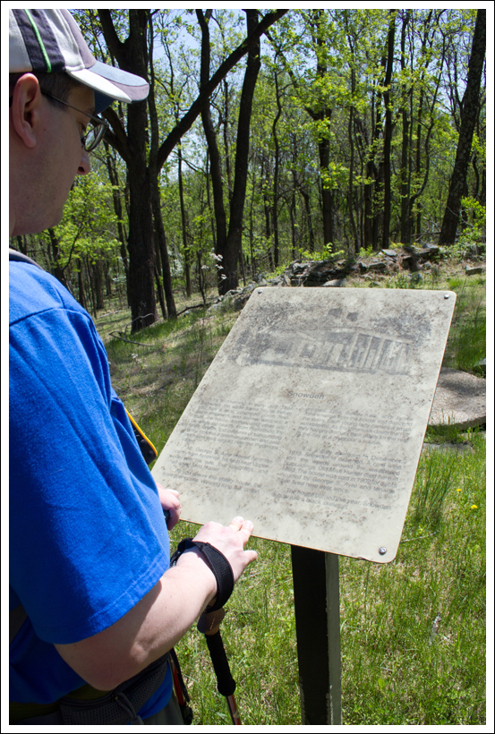 The Snowden House ruins. Below: We crossed this small stream early in the hike. It’s probably dry most of the year; Adam makes his way up the South Ridge Trail; Adam reads information about Snowden; Dogwoods were at their peak.