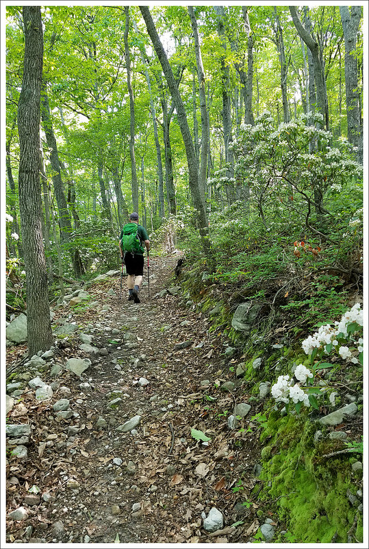 Another angle on the view. Below: Blooming mountain laurel; I stopped by the Maupin Field Shelter on my way back; Near the shelter the trail splits into the AT and a fire road. Make sure you remain on the well-marked AT.