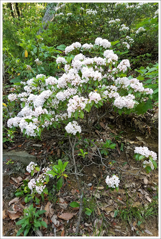 The mountain laurel was in full bloom. Below: The Appalachian Trail is nicknamed ‘the green tunnel’ for a good reason; Rose of Sharon/Wild Hibiscus (I think); I missed the peak bloom of the Catawba Rhododendron.