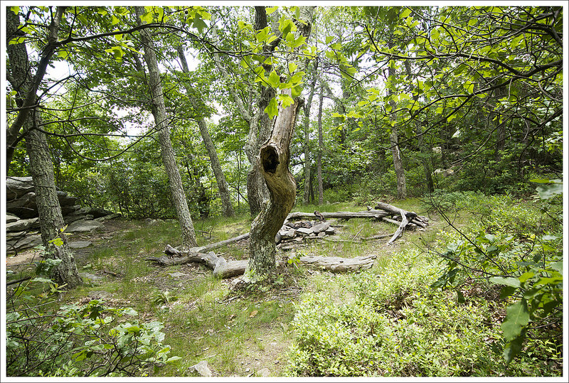 There were some pretty views through the trees on the climb to Signal Knob. The higher we climbed, the prettier the mountain laurel became. Low elevation laurel had already gone to seed. Below: A neat tree before the Buzzard Rock Overlook; Buzzard Rock Overlook; Fort Valley Overlook.