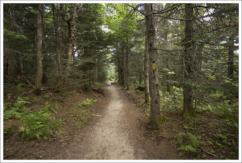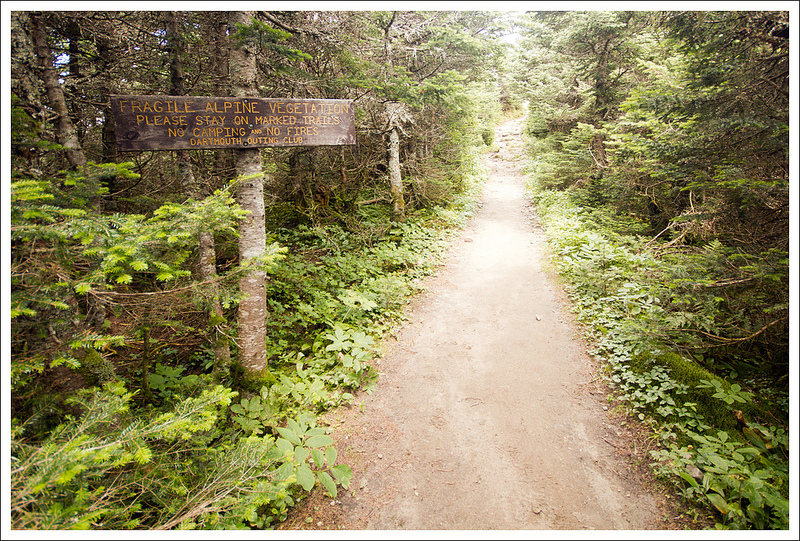 Leaving the summit, we briefly followed the white-blazed Glencliff trail (which is also the Appalachian Trail across this mountain) to its junction with the Carriage Road. This section of trail was almost perfectly flat and went through more areas that resembled large groupings of Christmas trees. We could have taken a detour to visit the South Peak of Moosilauke, but we decided to skip it.