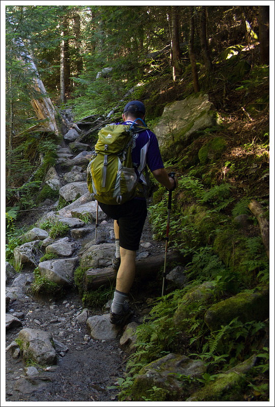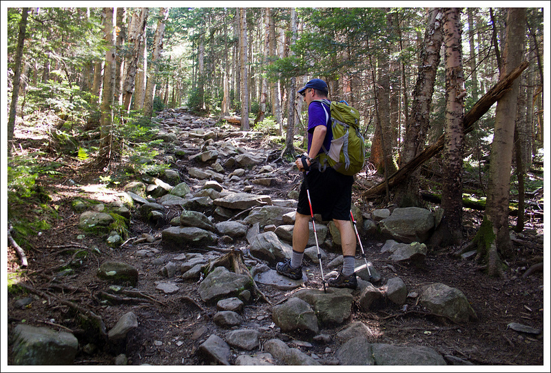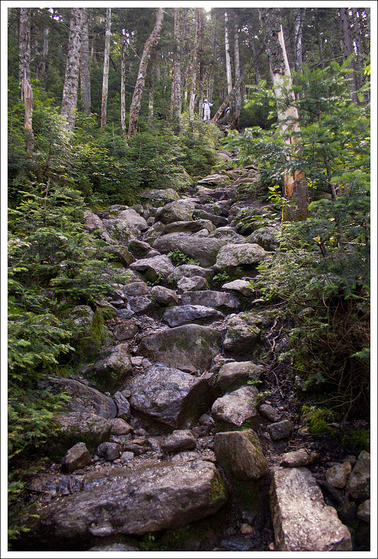 The first .4 miles along the trail were relatively flat as it meandered through a wooded area. We crossed a footbridge at the base of a small waterfall and at .4 miles, we reached a junction with the Crawford Path. Taking a left at the junction, we began our ascent. The ascent begins while paralleling the Gibbs Brook on the left of the trail. The trail was extremely rocky which was making each step a challenge, as I felt like I was doing a demented, granite-laden version of a StairMaster. Most of the trail to the summit consists of having to step on rocks, so there is little evidence of soft ground to place your feet. I would recommend shoes with good padding, thick comfortable socks, ankle support, and trekking poles to help yourself along.