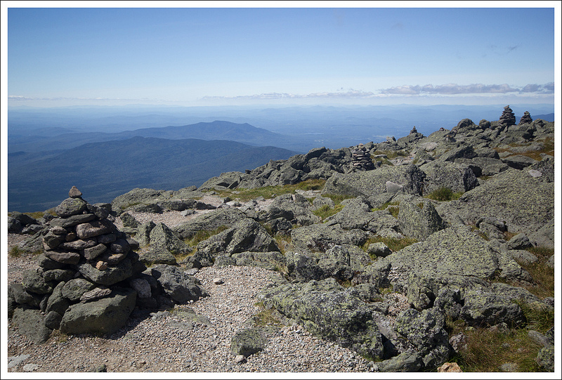 At 2.3 miles you reach a break in the trees and can see your first views of Mount Carr, Mount Cardigan, and Mount Kearsarge. The trail continues to ascend and then loops back around to the northwest as you gain some more views from the area known as The Balcony at 3.0 miles. The views were quite delightful and gave us something else to focus on as we labored up more rocky steps. The trail then ducks away from the views and you find yourself soon immersed into a dense forest of spruce and fir as the trail snakes through. You will see signs reminding you to stay on the trail to protect the fragile vegetation. At about 3.25 miles, you will come out of the trees and into the open alpine area. Large cairns are placed on the side of the trail. The summit looks misleadingly close, but due to the open nature it still takes about 10 minutes to reach the summit at 3.5 miles.