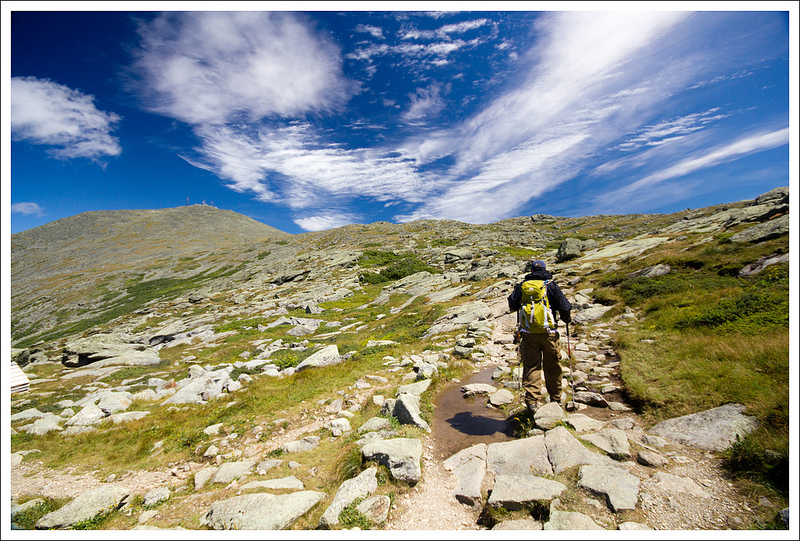 From Lakes of the Clouds Hut, you follow the Crawford Path (America’s oldest continually used hiking trail) to the summit of Mt. Washington. In this photo, you can see the summit and its weather towers looming in the distance. Below: The trailhead begins near the cog railway on Basecamp Rd; The beginning of the trail is deceptively easy; There are many water crossings en route to the top – some easy, some not so easy.