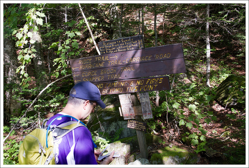 On our second pass-by, we were lucky to hit the summit with mostly clear views! Below: Adam makes his way up the Crawford Connector – a short spur trail from the parking lot to the Crawford Path; Trail signs and a sign for Mizpah Spring Hut; Gibbs Falls.