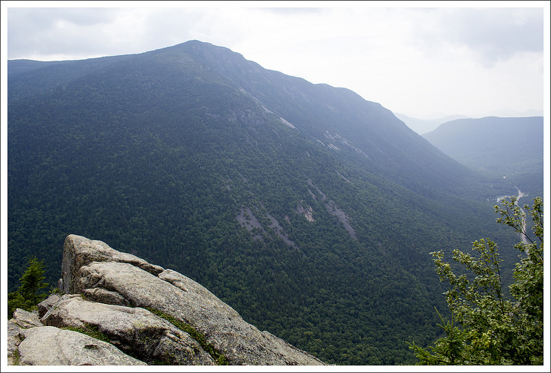 To start the hike, we followed the bike trail for a short distance before turning left onto the official trail. The trail started off relatively flat, and passed through three tunnels – one under Route 3 and two more under I-93. After a couple small stream crossings, the trail climbed steadily but moderately uphill. Like most New Hampshire trails, the way up was rocky and rooty. Near the top, the Indian Head Trail merged with the Mt. Pemigewasset Trail before emptying us out onto a smooth, wide ledge of granite. The drop-offs here are very steep and the granite can be slick/smooth, so take care!