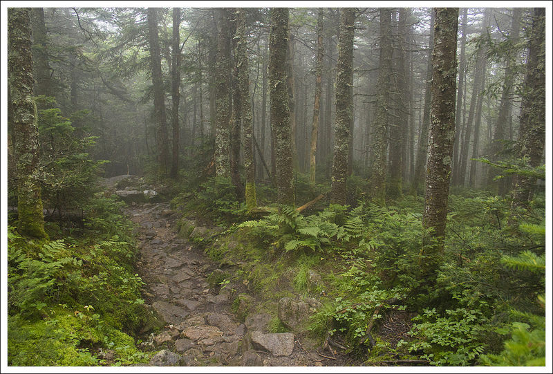 Even though the Crawford Path to the summit of Pierce is one of the least steep trails in the Whites, it is still very rocky and slick. Below: As we climbed, the woods got foggier and foggier; By the time we made it to the junction with the Mizpah Cutoff Trail we started to worry that we wouldn’t have a view at all; The Mizpah Cut-Off Trail departs the Crawford Path a little over a mile from the summit of Mt. Pierce.