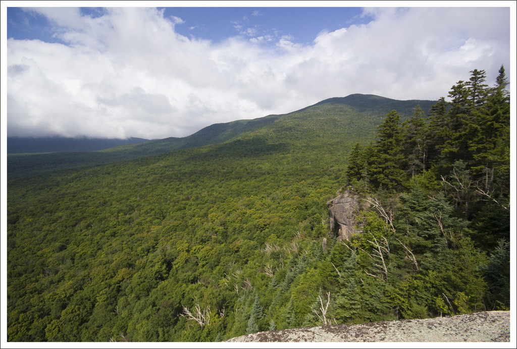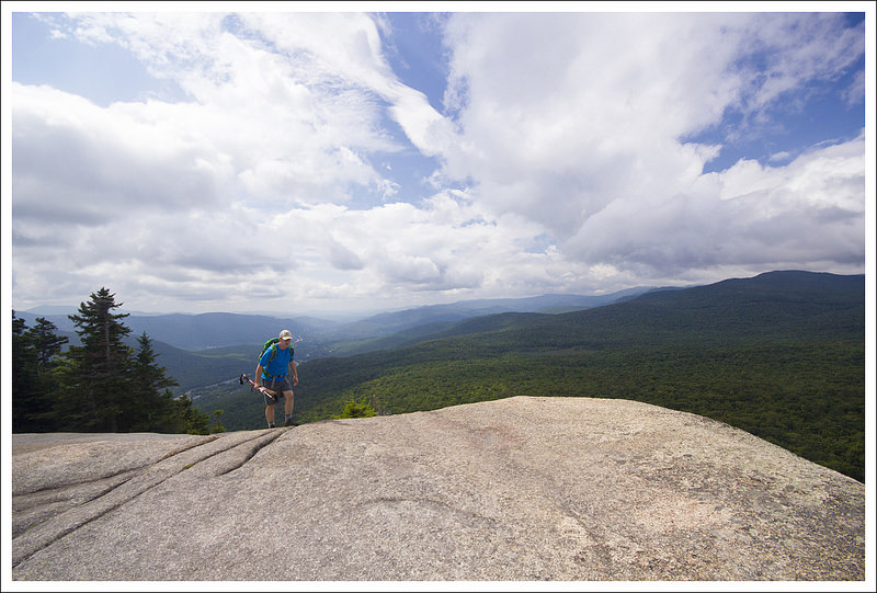 The Kinsman Ridge was covered by clouds when we visited. Below: Views looking south along I-93 and the Lakes Region of New Hamsphire; The summit is made of smooth granite; More summit views.