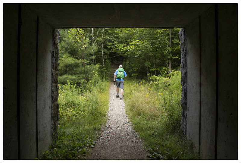 Adam on the summit of Mt. Pemigewasset. Below: The beginning of the hike follows the bike path for a short distance; One of the three tunnels on the hike; Adam crosses a small stream.
